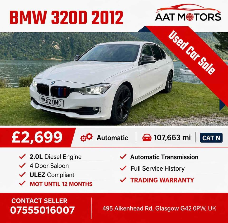 This is a well-priced 2012 BMW 320D Sport saloon, currently available for just £2,699 as a Category N vehicle. This specific model, finished in white and carrying registration YK62OMC, is powered by a 1995 cc diesel engine delivering a healthy 181 BHP through a manual gearbox. The car is showing 107,663 miles, which translates to a relatively low annual mileage of approximately 8,100 miles, and it will be supplied with a full 12-month MOT. Please note, with a Euro status of 5a, you’d probably want to check the specific ULEZ compliance status. The vehicle comes with a full service history and HPI checks confirm it’s not recorded as stolen.