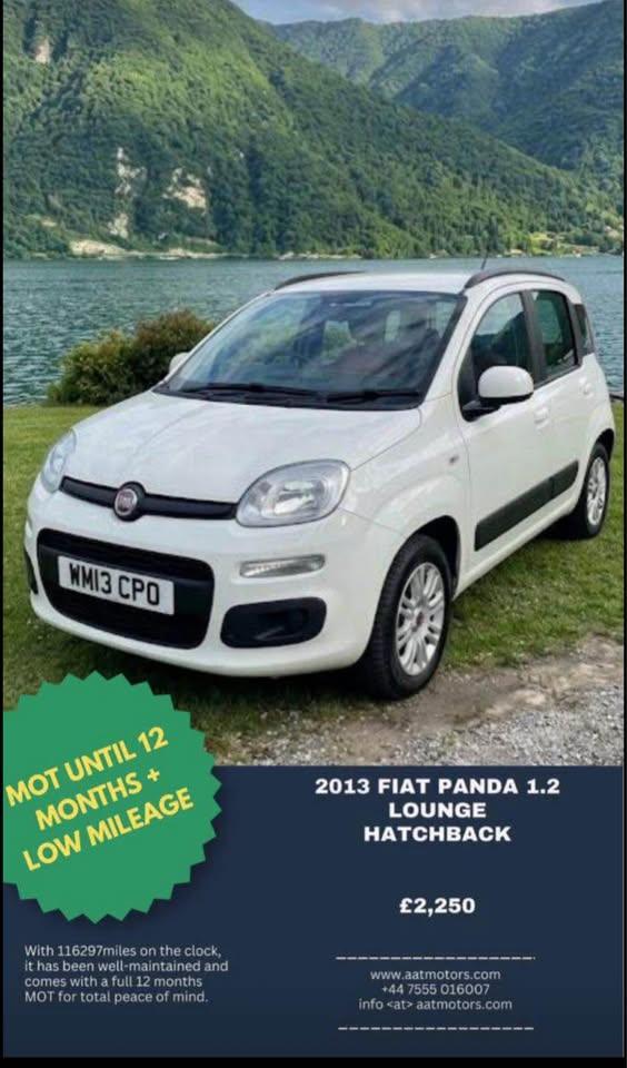 This 2013 Fiat Panda 1.2 Lounge Hatchback has been driven 116297 miles and runs on petrol. It comes with 4 seats and 5 doors, making it a convenient choice for families and small groups. With its ULEZ compliance, it’s a suitable option for driving in cities with low emissions zones. The car is equipped with a manual transmission and Euro 5 engine, delivering 69 bhp. Its MOT is valid until 22/04/2027, providing peace of mind for the next few years. This hatchback offers practicality and style, making it a versatile option for urban and suburban driving.