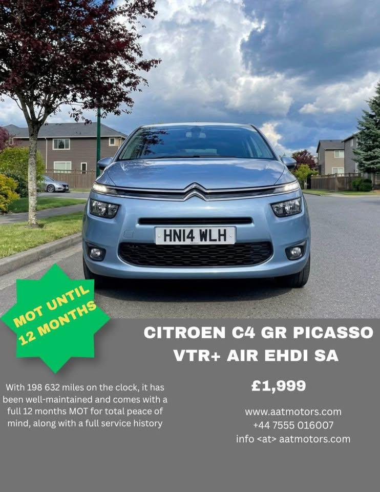 £1,999Vehicle Specifications Make & Model: Citroen C4 Grand Picasso VTR+ Air E-Hdi Engine: 1.6L (1560 cc) Diesel Transmission: Etg6 Auto with Start/Stop technology Performance: 91 BHP Euro Status: 5b Color & Body: Blue, Medium MPV (Multi-Purpose Vehicle) Registration History Registration Date: June 10, 2014 V5C Issue Date: September 23, 2025 Registered Location: Portsmouth / Hampshire and Dorset area Current Age: 11 years and 9 months Mileage & Condition Last Recorded MOT Mileage: 198,632